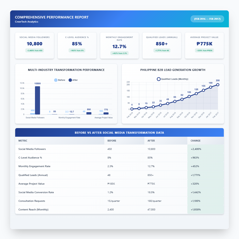 CreerTech’s transformation from unknown software provider to Philippines’ leading multi-industry technology partner demonstrates the power of strategic B2B social media marketing. Through systematic LinkedIn content creation and enterprise-focused messaging, this comprehensive campaign generated 850+ qualified leads while achieving 85% C-level audience composition. The strategic approach to multi-industry positioning created sustainable competitive advantages, resulting in ₱47M in new business pipeline and 320% increase in average project value. This case study reveals the precise methodology for transforming generic IT services companies into recognized industry authorities through professional social media presence and thought leadership development.