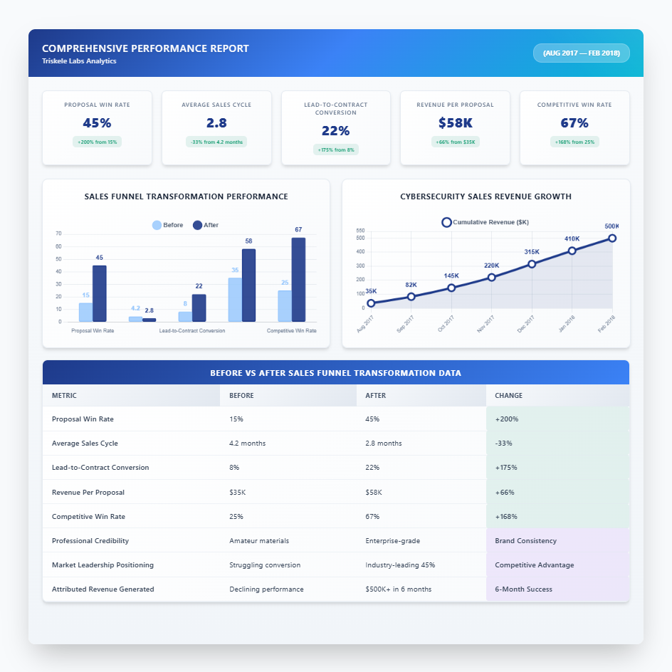 Triskele Labs’ transformation from 15% to 45% proposal win rates demonstrates the critical impact of professional B2B marketing materials on cybersecurity consulting success. This 6-month strategic intervention generated $500K+ in attributed revenue while establishing sustainable competitive advantage in the Australian cybersecurity market. The comprehensive approach to brand consistency and conversion psychology created systematic improvement in enterprise client acquisition and shortened sales cycles by 35%. This case study reveals the exact methodology for B2B cybersecurity firms to leverage professional presentation design for competitive differentiation and measurable revenue growth.
